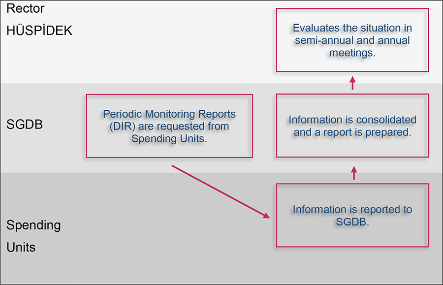 After the plan is put into effect, the data from the spending units are consolidated in SGDB and a Monitoring and Evaluation Report is prepared. The report containing the evaluation results of the plan is annually submitted to the Presidency Strategy and Budget Directorate after the approval of the rector. The report is reviewed by HUSPIDEK for the necessary interventions to the targets that cannot be achieved and the necessary measures are taken.