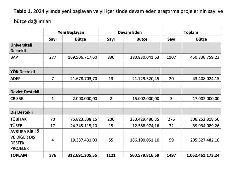 Başkanlığı ve %2’sini TÜSEB projeleri oluşturmaktadır. Üniversitemizde 2024 yılında yeni ve devam eden projelerin sayısı 1.497’ye, toplam bütçesi ise 1.062 milyon TL’ye ulaşmıştır. Toplam bütçe içerisinde Üniversite Destekli BAP projeleri %42’lik pay ile en büyük dilimi oluştururken, TÜBİTAK projeleri %29, Avrupa Birliği ve diğer dış destekli projeler %19, TÜSEB projeleri %4 ve Cumhurbaşkanlığı Strateji ve Bütçe Başkanlığı destekli projeler ise %2 oranında yer almaktadır (Tablo 1).