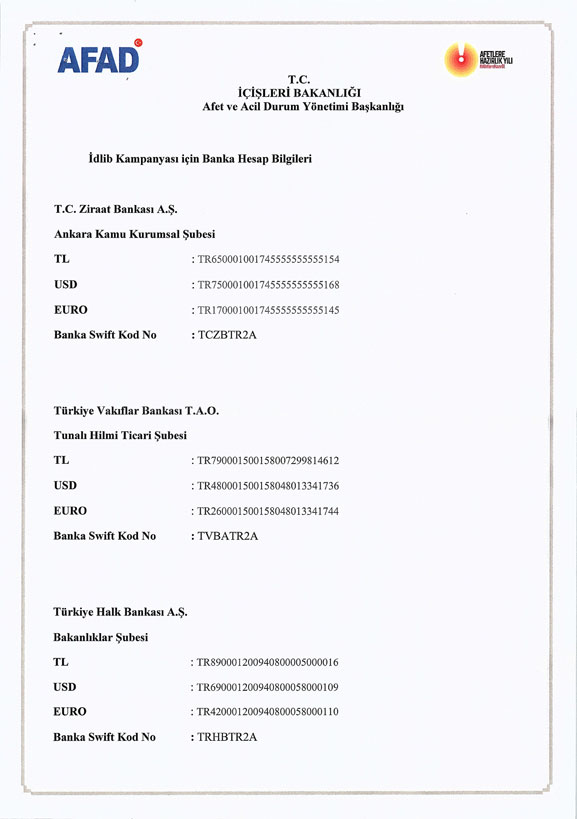 İçişleri Bakanlığı tarafından başlatılan “Bir Aradayız, İdlib’in Yanındayız” insani yardım kampanyası hesap bilgileri aşağıdadır.