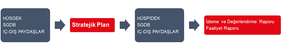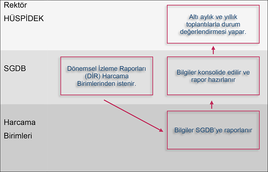 Strateji Geliştirme Daire Başkanlığı stratejik plan izlemelerinde, hedeflerden sorunlu olan harcama birimlerinden, gerçekleşme sonuçlarını alıp konsolide eder ve Stratejik Plan İzleme ve Değerlendirme Kurulu’na raporlar. Kurul birimlerden gelen bilgiler ışığında plan dönemini değerlendirir.