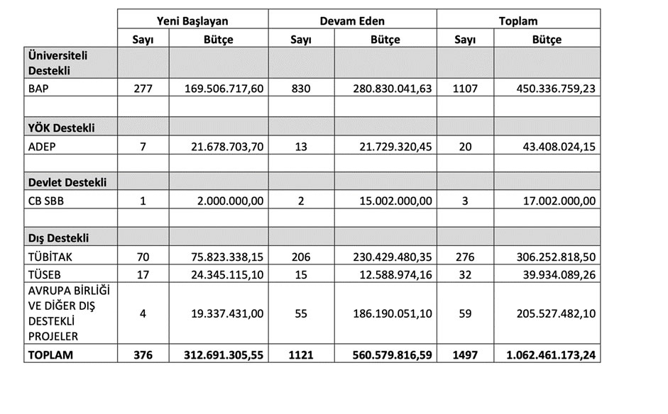 Table 1. Number and budget of research projects being carried out by Hacettepe University researchers in 2024 (transferred from the previous year + newly started) and funded by different institutions